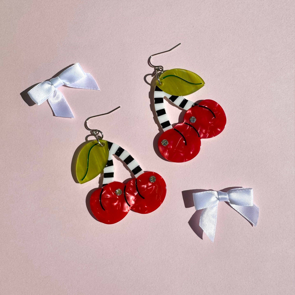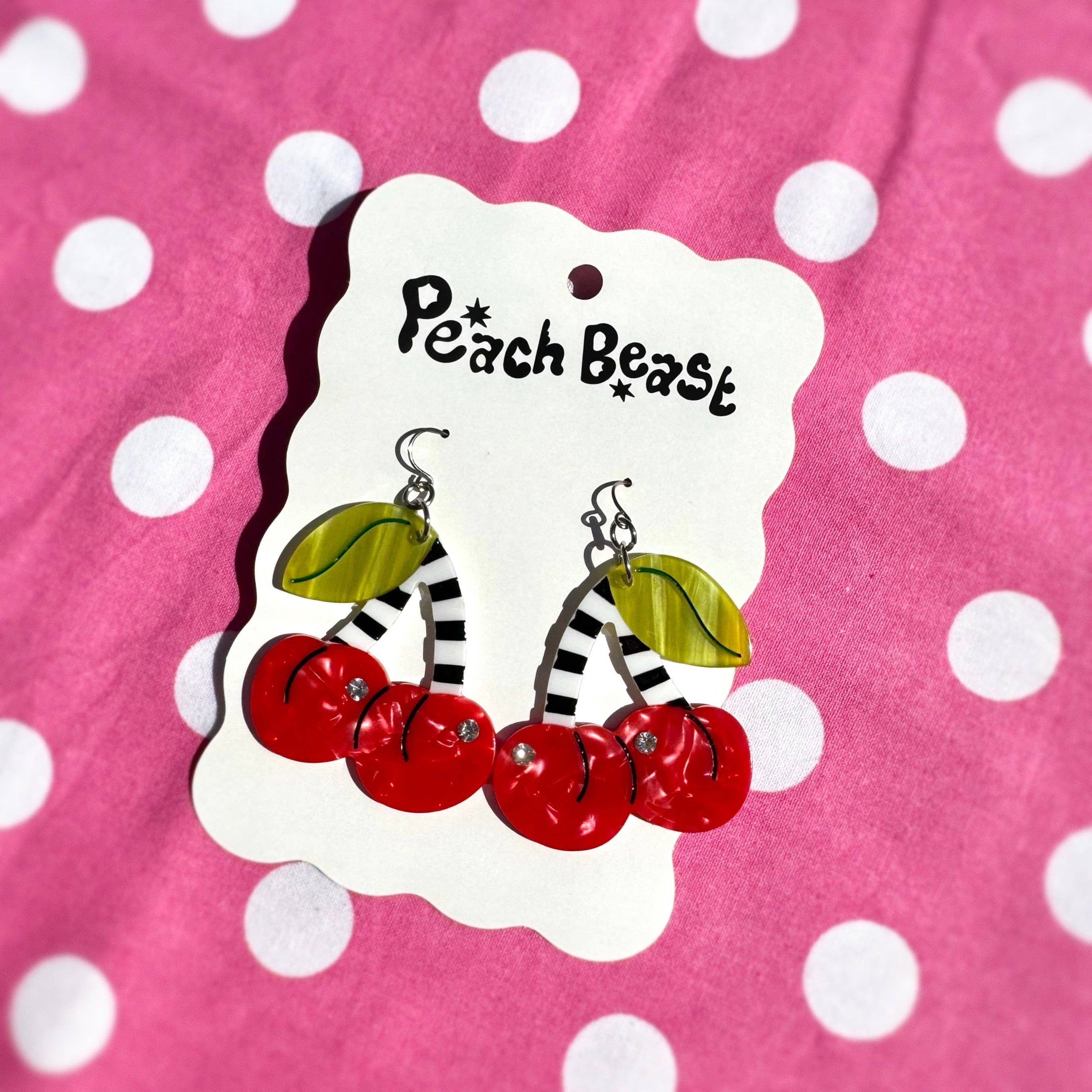 These cute cherry earrings have been reimagined to fit in a Peach Beast universe. A little punk twist on a classic icon. The little rhinestone detail is perfection!