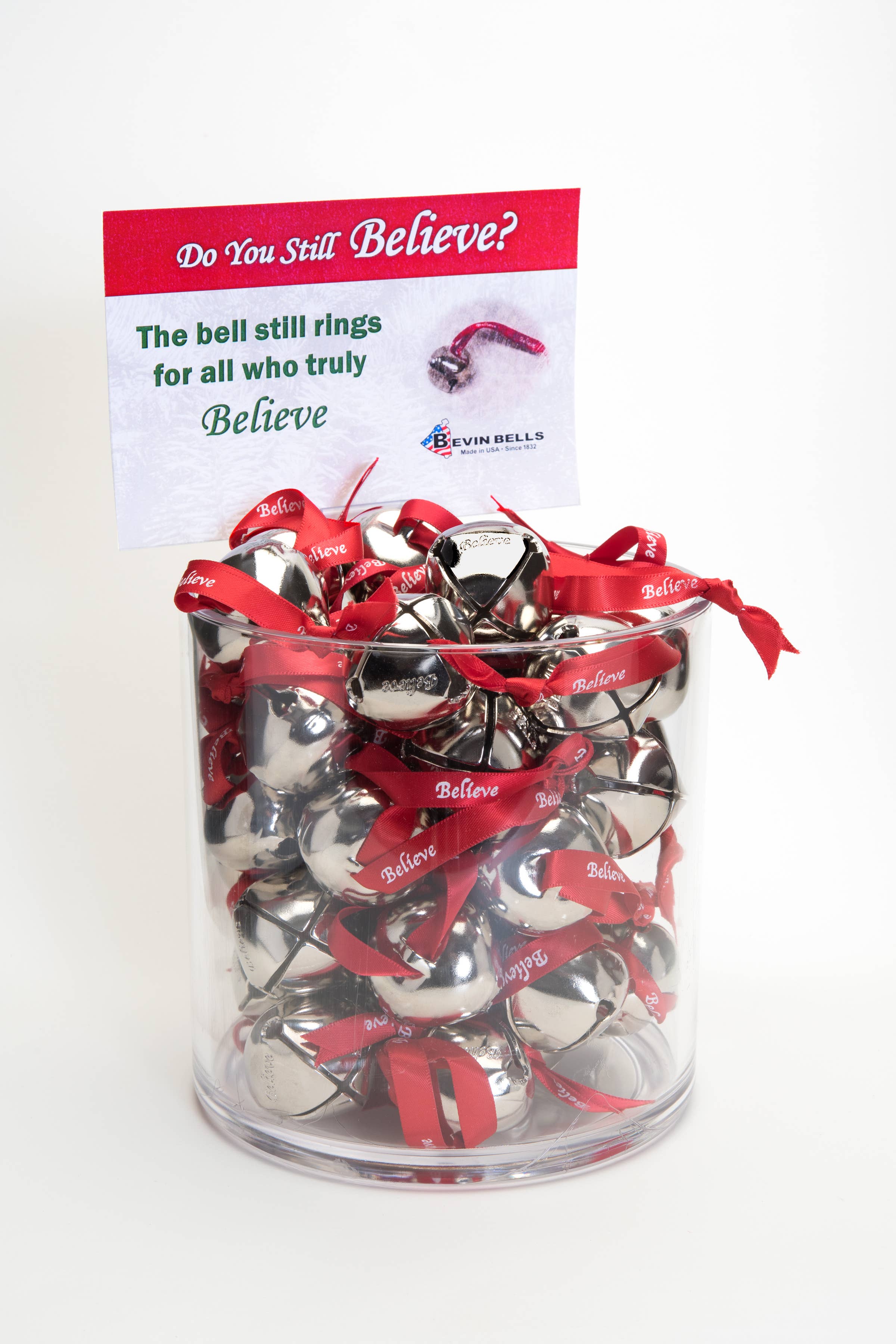 One of our most popular items. Do you still believe? Can you hear the bell ring? Celebrate the Christmas season and the joy of still believing with this 1.5" high quality sleigh bell ornament. It has Believe stamped into the bell and is strung with Believe ribbon.