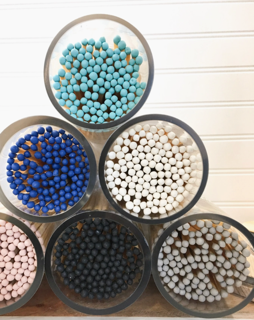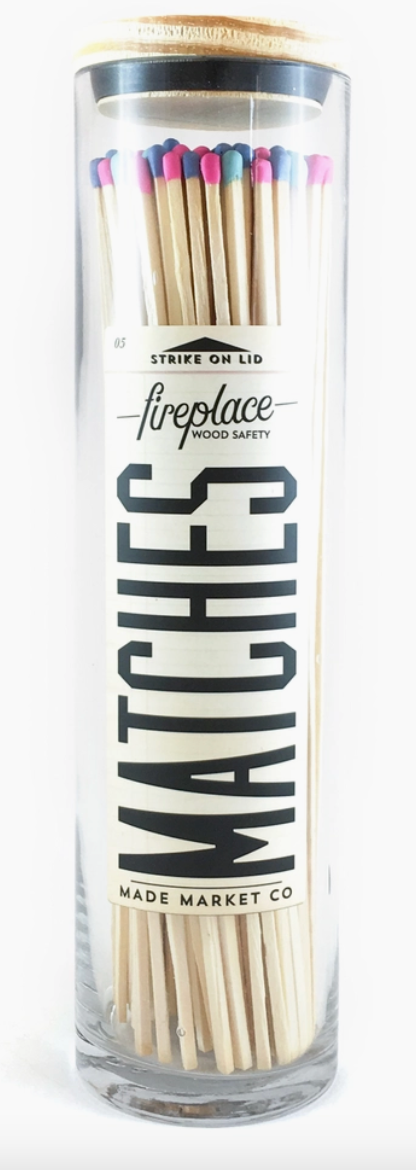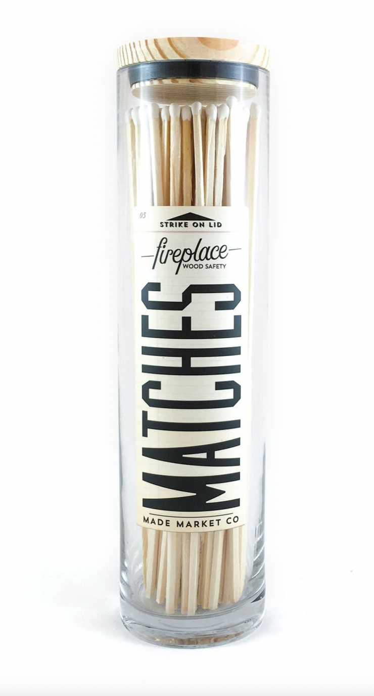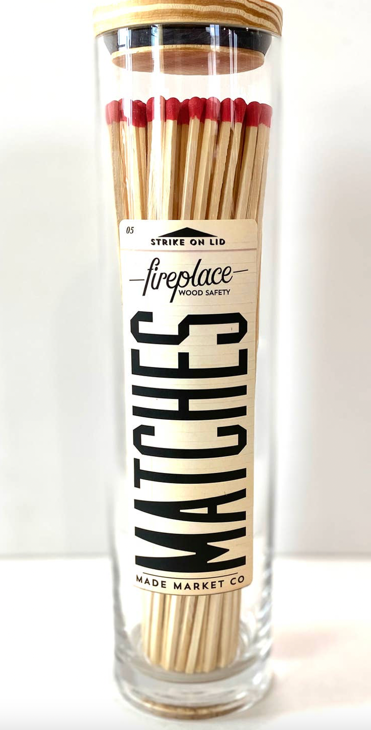 Why not decorate your home with functionality & style?! Dress your mantel with these Fireplace Matches! The beauty of the vessel and overall design will make you smile instantly! With so many color options, we can enhance any mood or curated space. Striker on lid so you don't have to tip the vessel! • 120 count • 10" matches • 12" bottle • 3" round bottle • wood top with striker • durable & high quality!