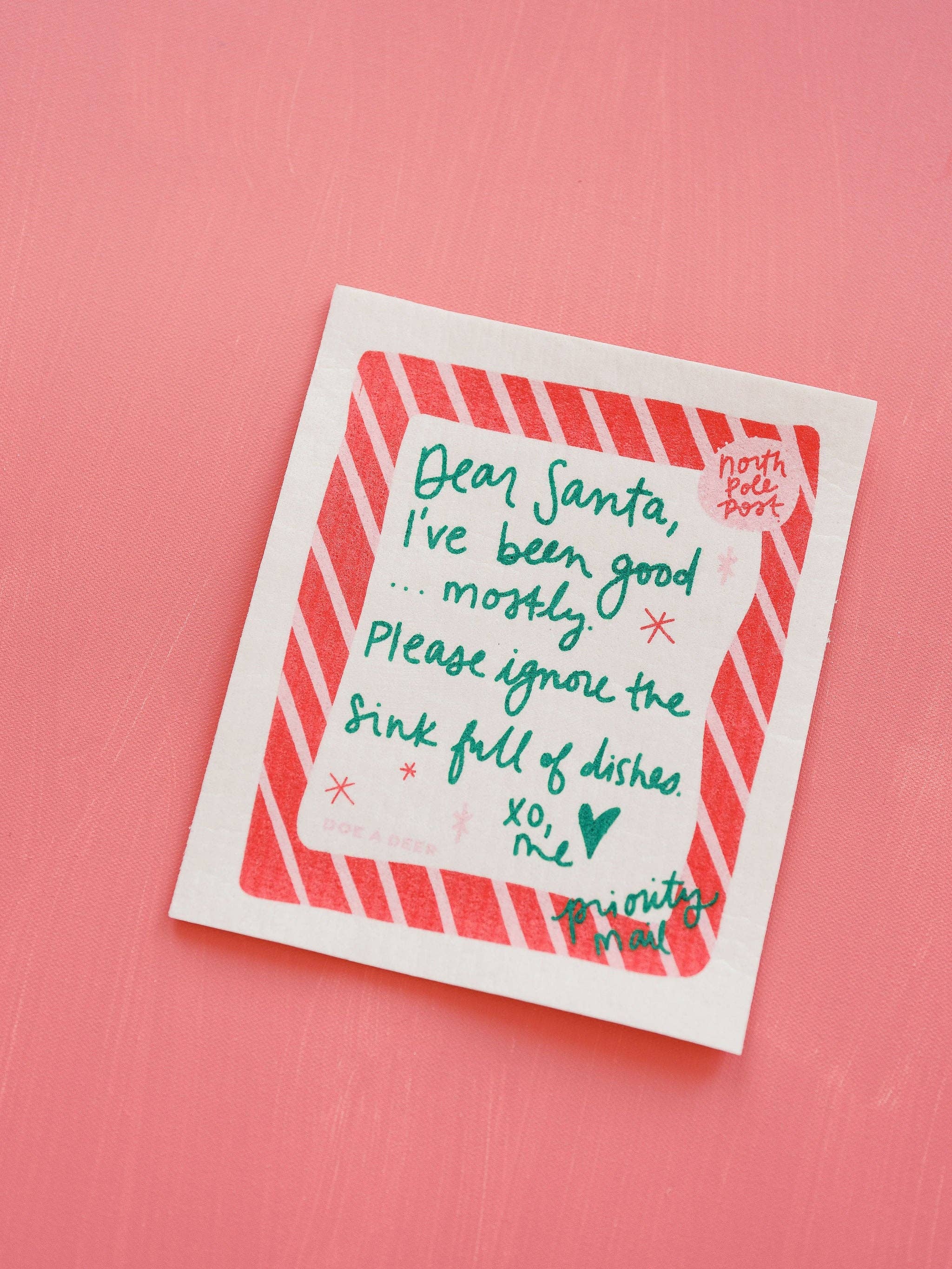 Add a little holiday humor to your cleanup routine with this cheeky Swedish dishcloth featuring a handwritten note to the big guy himself. Made from eco-friendly cellulose and cotton, it’s ultra-absorbent, quick-drying, and ready to tackle that sink full of dishes—no judgment here!