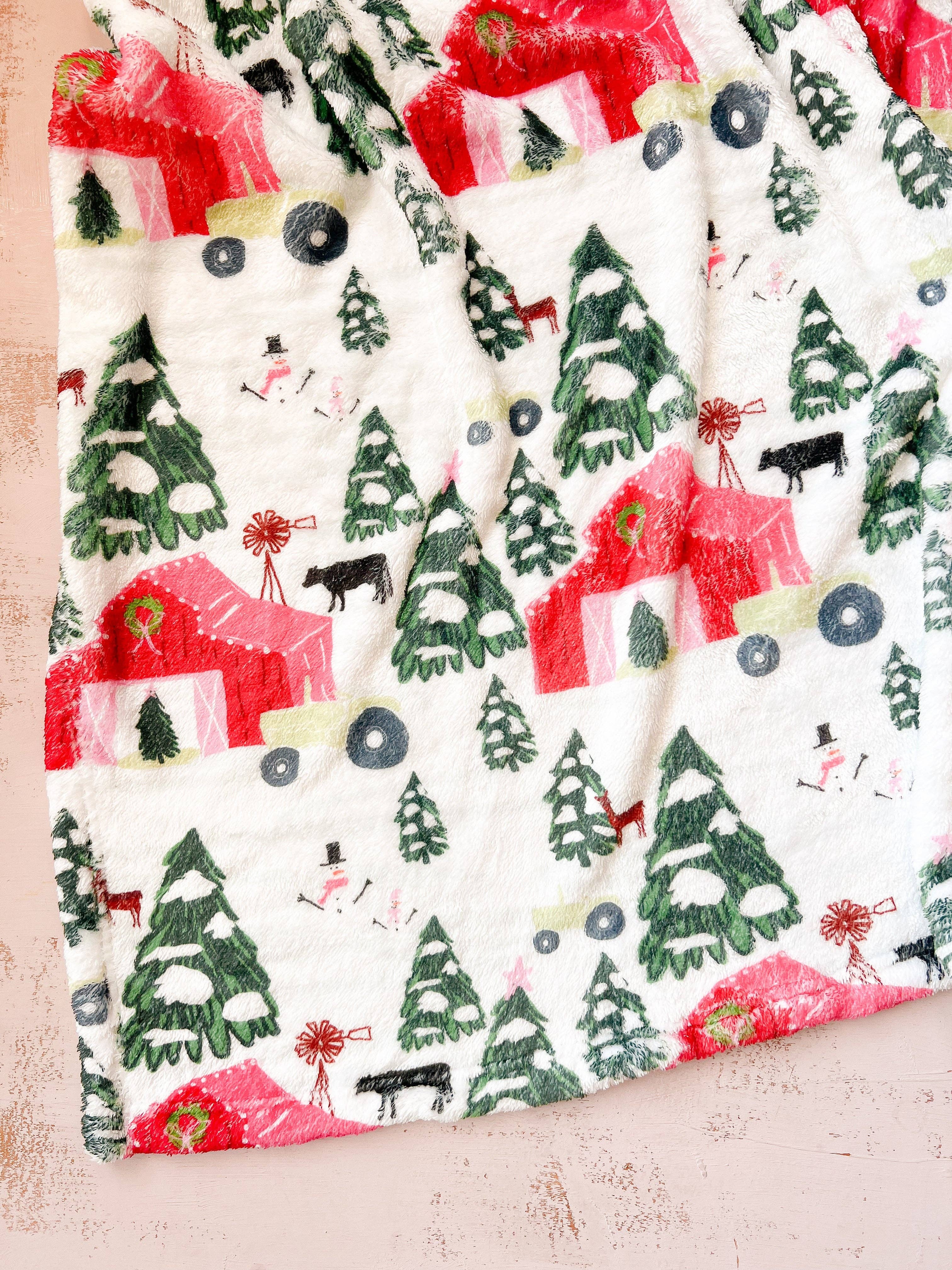 Wrap yourself in farmhouse holiday charm! This Festive Farm Throw Blanket features a cozy winter scene with a red barn, snow-covered evergreens, cheerful snowmen, and a tractor or two—bringing the magic of a country Christmas to your couch. Soft, snuggly, and perfect for chilly nights, movie marathons, or gifting to your favorite farm-lover.