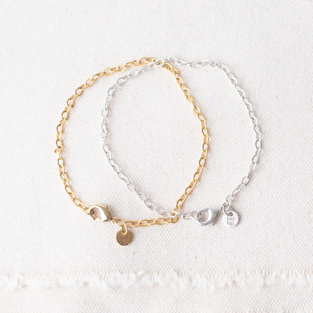 First step to your charm bar - the chain bracelet. Choose between two different metals: gold or silver.