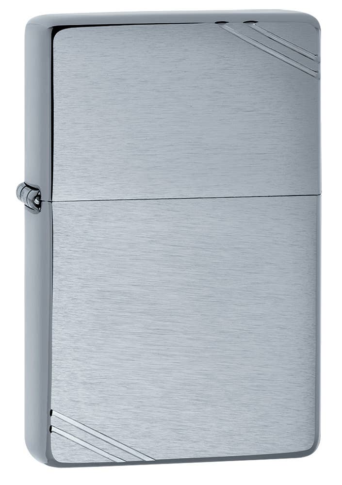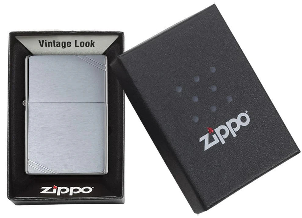 There's nothing old about this vintage model. Features rounded corners and edges replacing the 1935 square case. This Brushed Chrome windproof lighter has slashes on the corners of this lighter. Comes packaged in a gift box. For optimal performance, fill with Zippo lighter fuel.