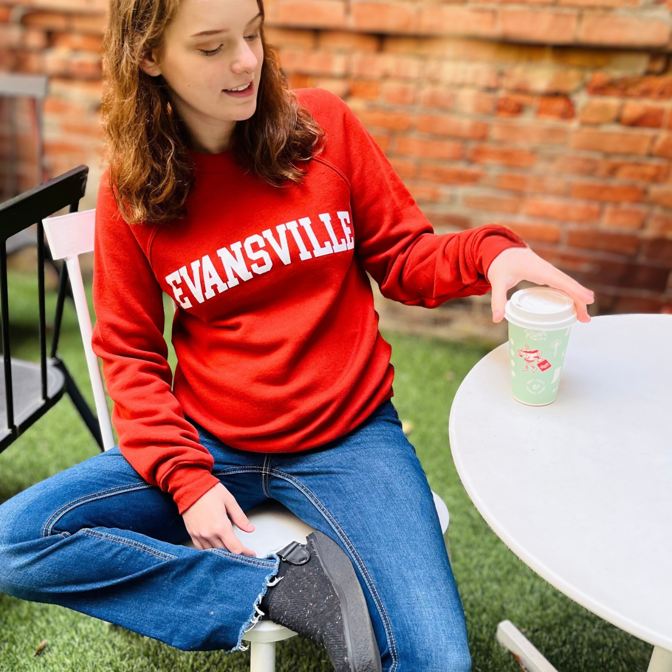 Evansville is screen-printed on a brick colored Bella + Canvas fleece crewneck. This ultra-soft crewneck is a must have as the weather drops!
