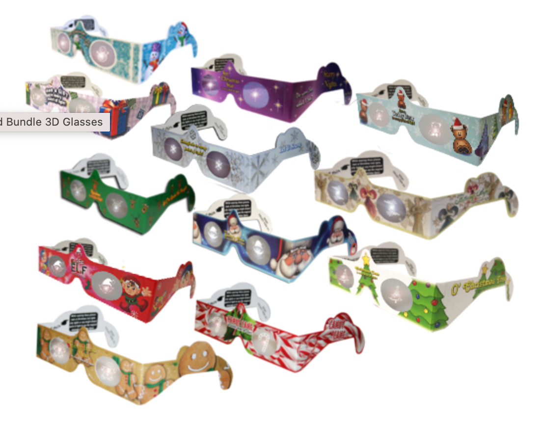 3D Christmas Glasses for viewing Christmas Lights on Christmas Trees, Houses or any Point of Lights that create a holographic image. Made In The USA