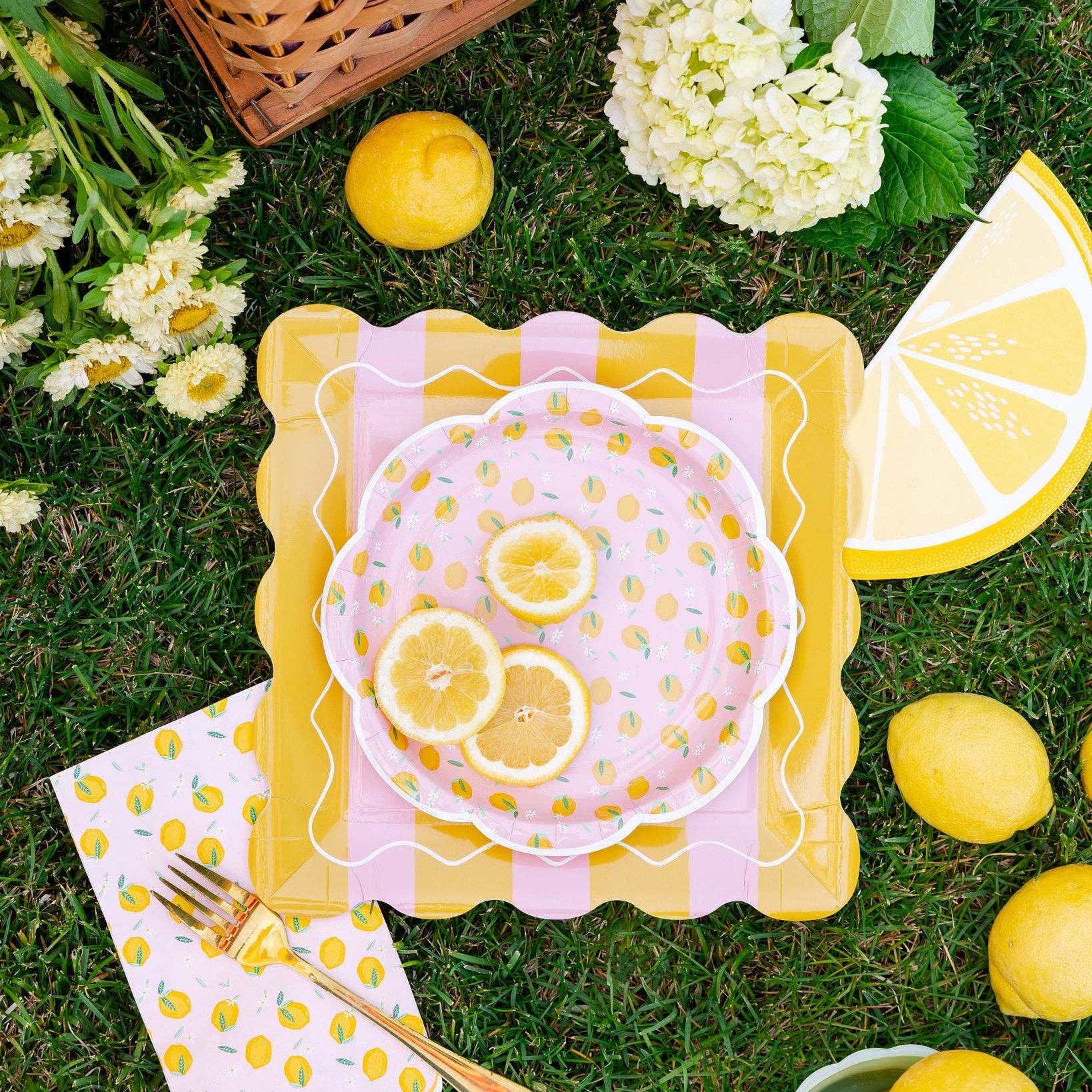 Brighten your party with these Yellow & Pink Striped Scalloped Square Plates