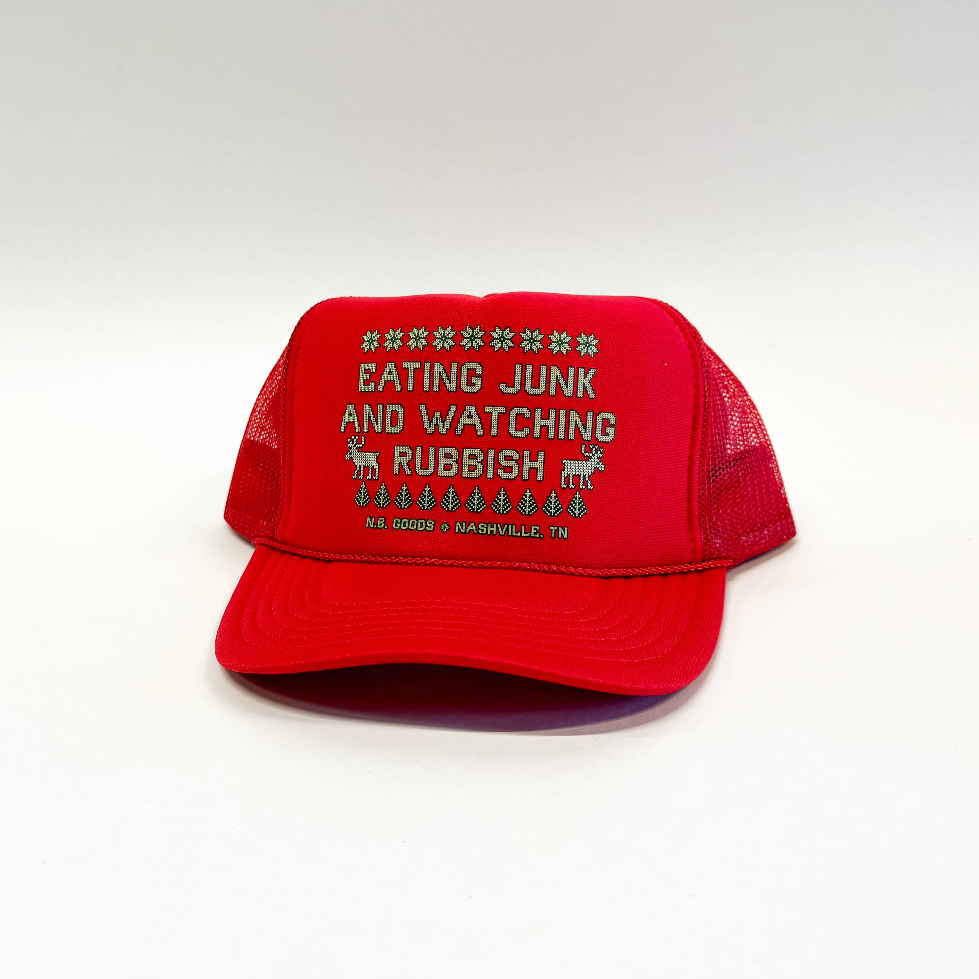 - Red high crown foam trucker with matching braided rope, adjustable snapback and green & white