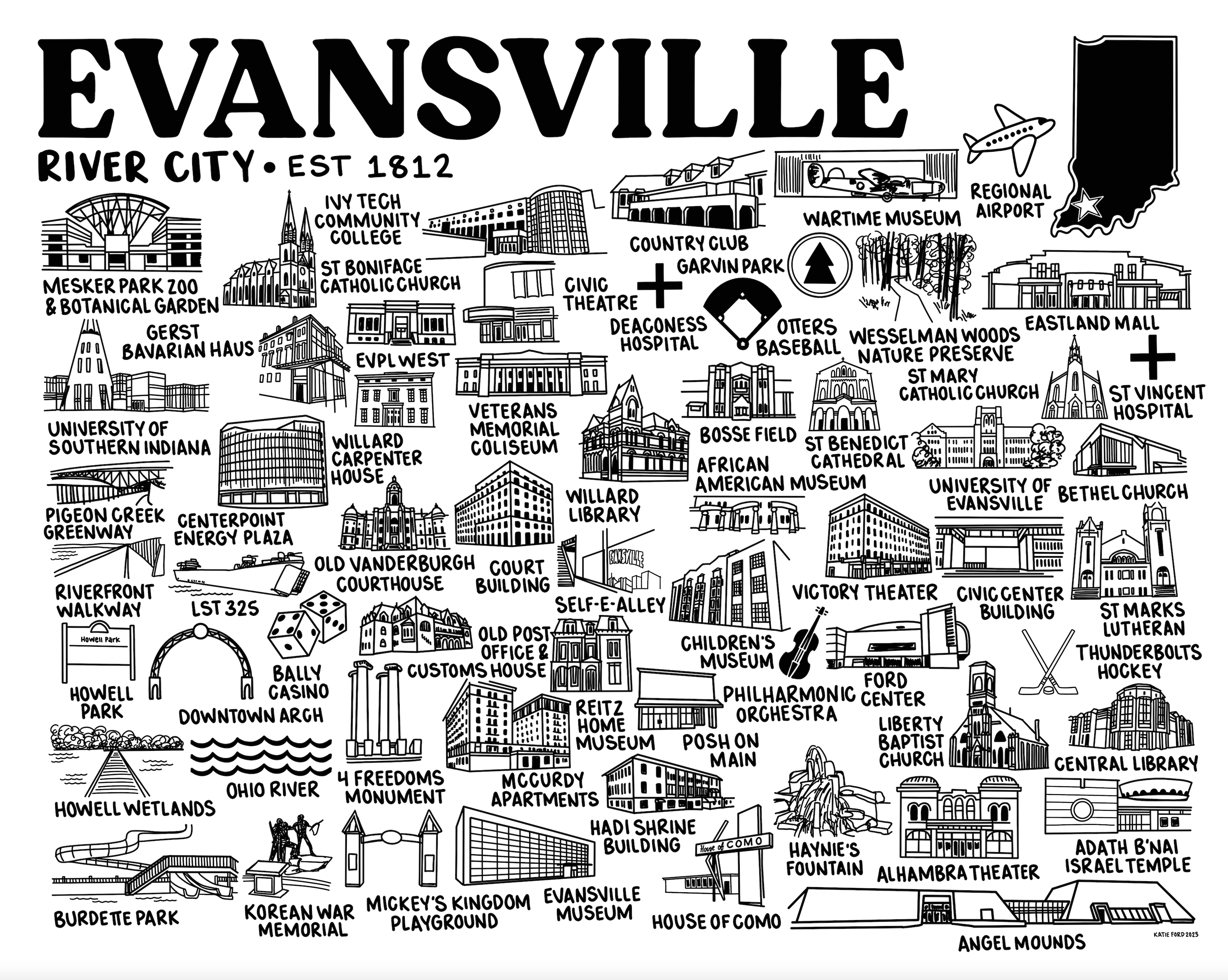 These Giclee prints feature an original hand drawn map of Evansville, Indiana done by artist Katie Ford. Giclee prints are on archival matte paper, and they are UV resistant. Your print will arrive carefully packaged and wrapped with backing board in a sealed plastic sleeve.