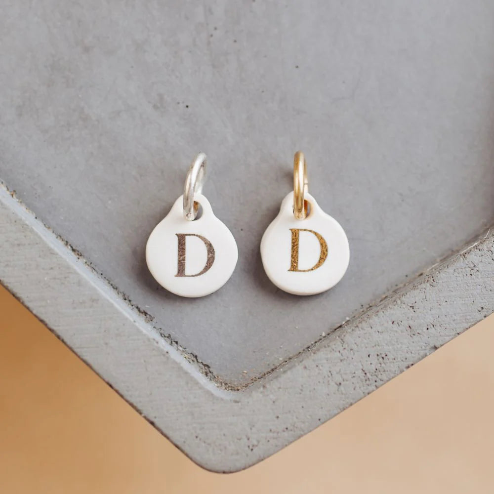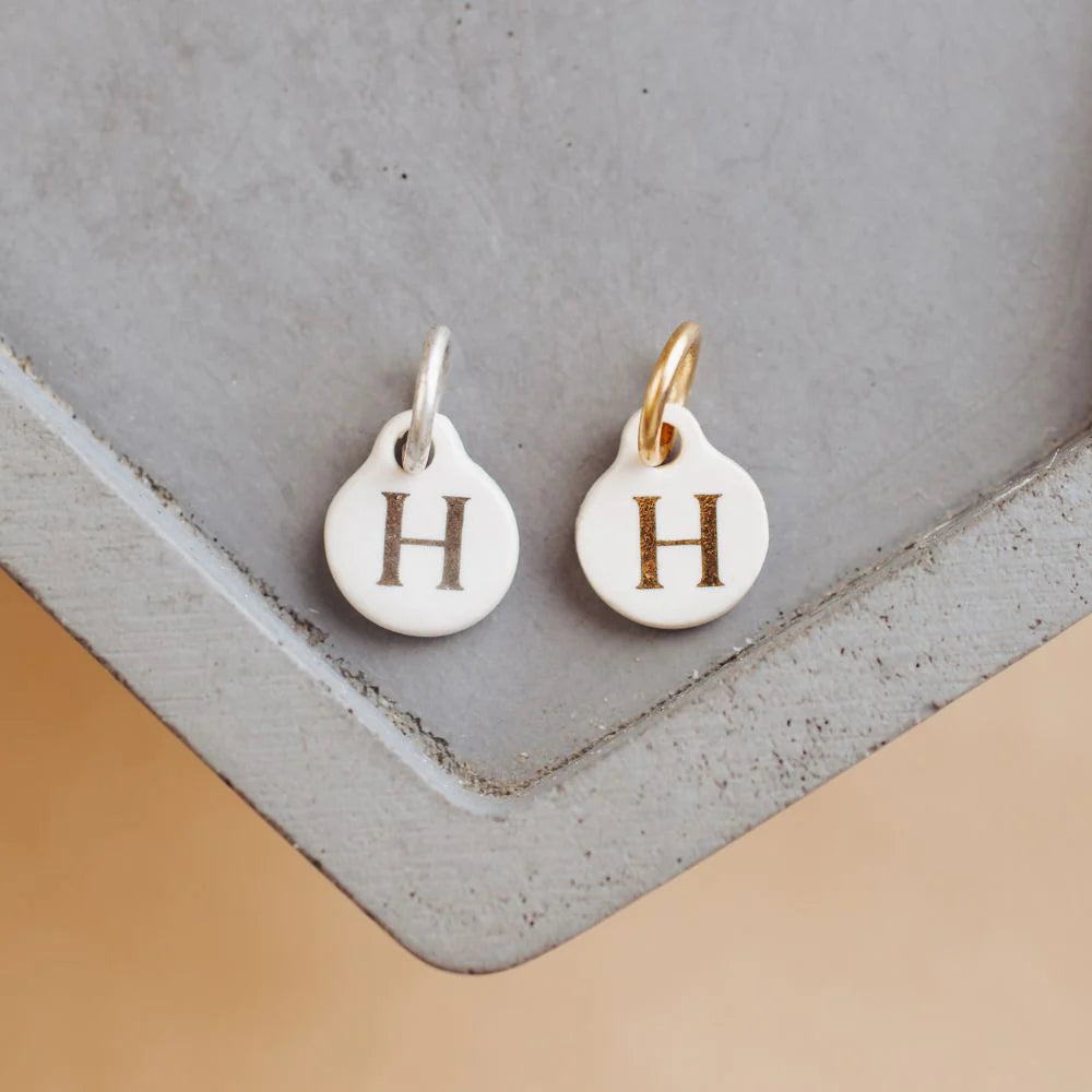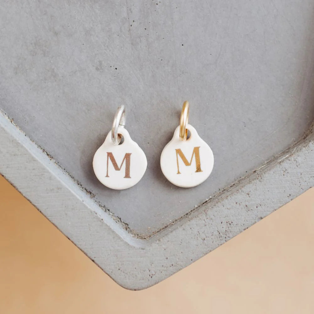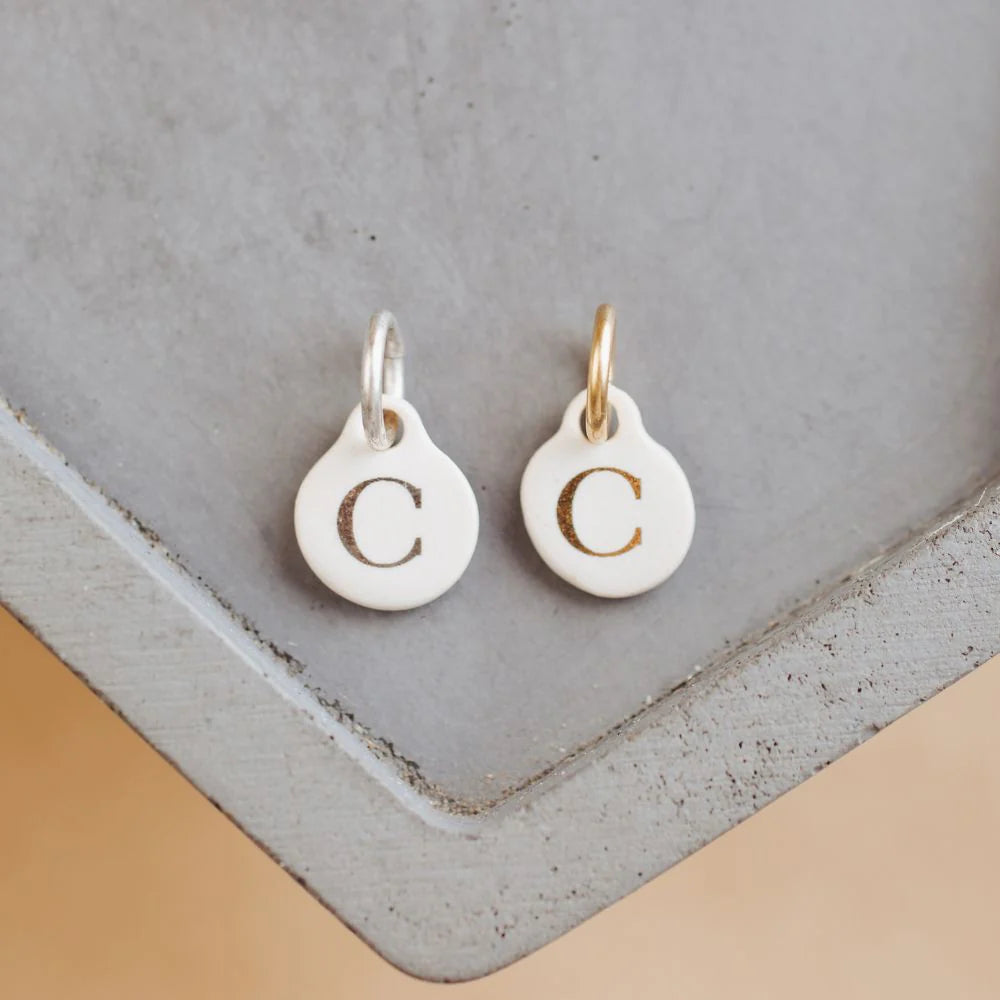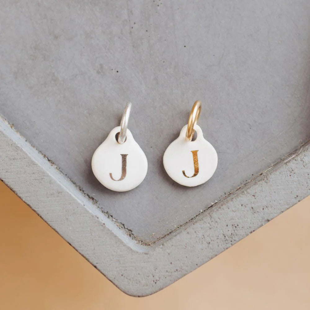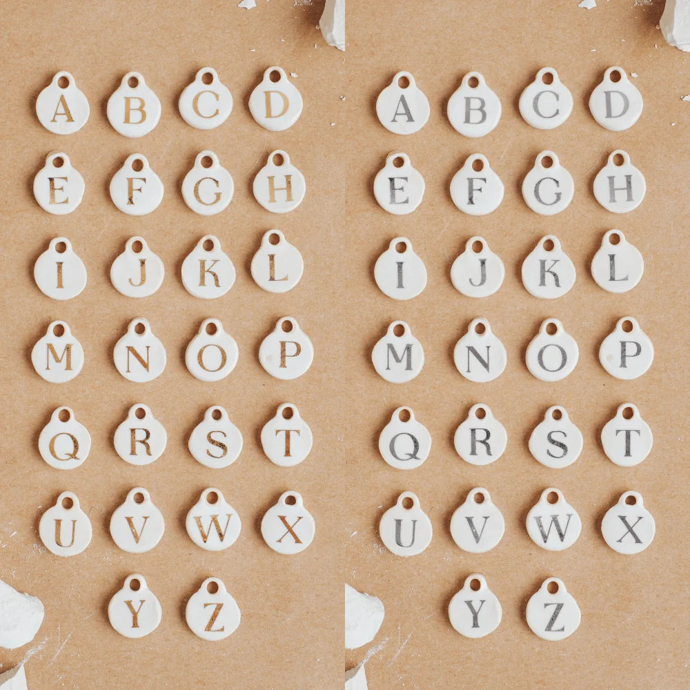 Time to add charms! These ceramic initial charms are made from high-fired stoneware clay. Choose between two different metal initials and jump rings: gold or silver.