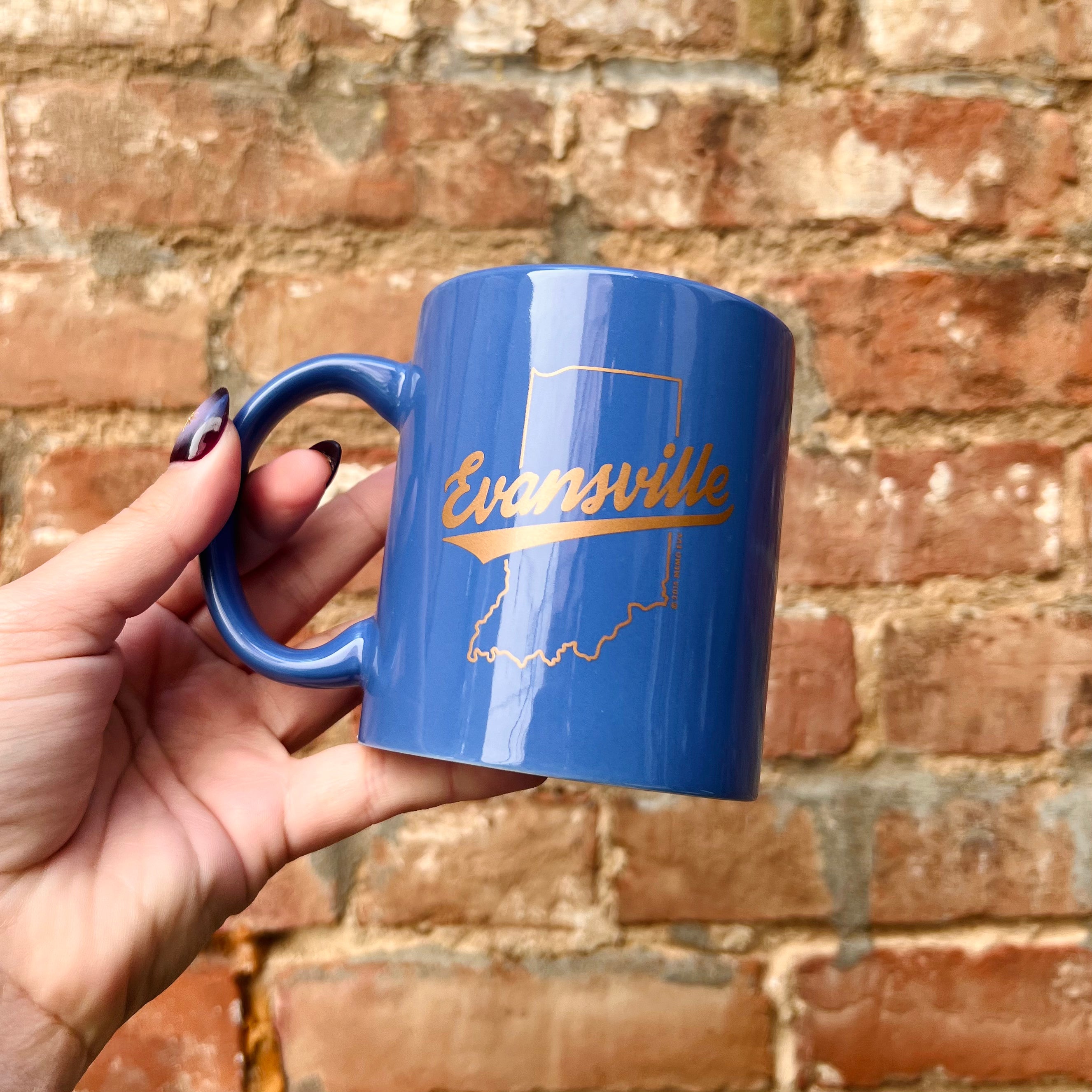 This classic mug features the 'Evansville Script' design with an Indiana state outline all in gold foil against a solid ocean blue color.