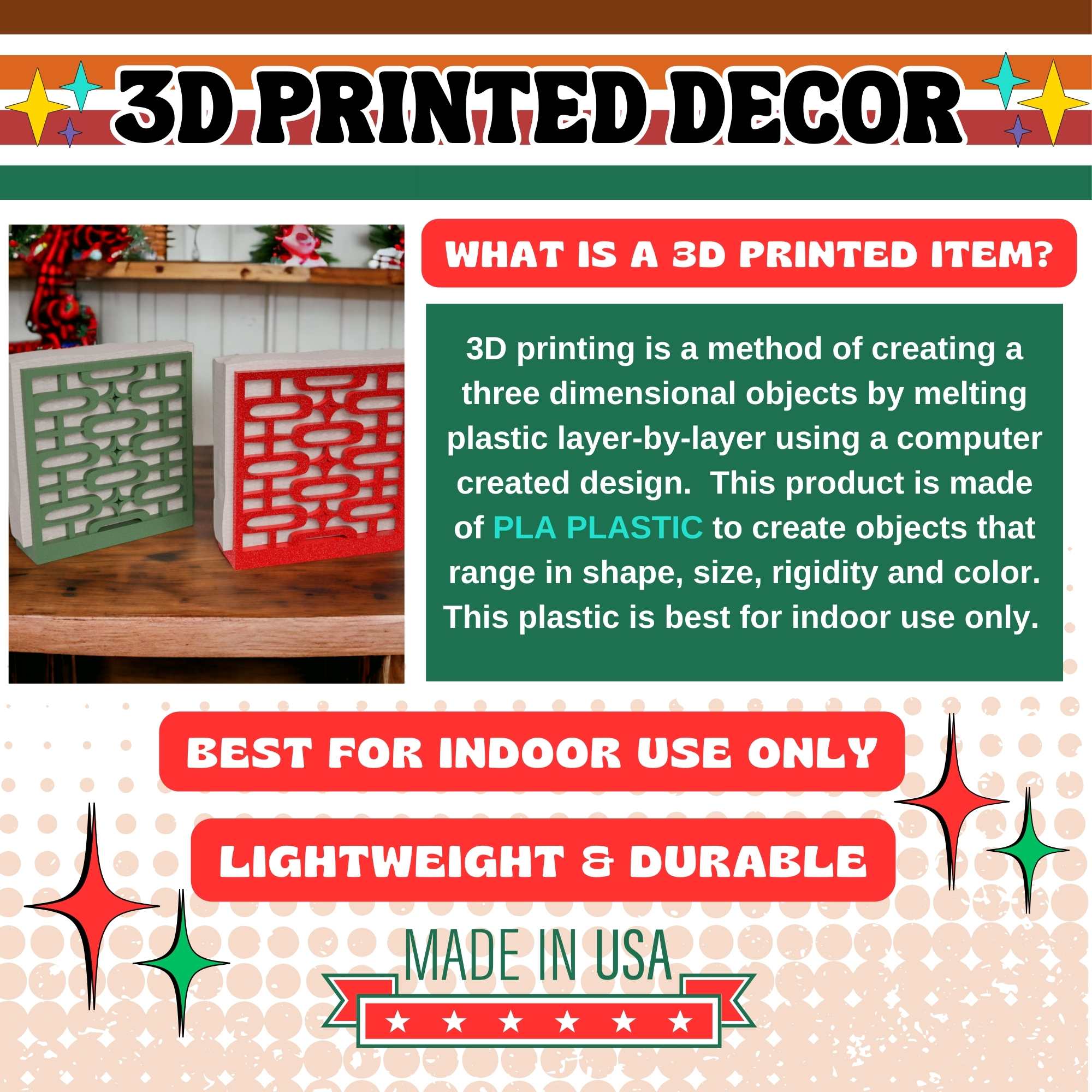 Our products are made from high quality PLA plastics. Made with a 3d printer! They effortlessly adapt to indoor and outdoor settings with remarkable versatility.