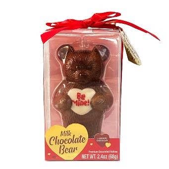 Say "Be Mine" with the sweetest Valentine’s surprise! This hollow milk chocolate bear is all dressed up with a red ribbon and holding a heart-shaped piece of white chocolate, complete with a love note inside. Smooth, creamy, and irresistibly adorable, it’s the perfect way to show someone you care.