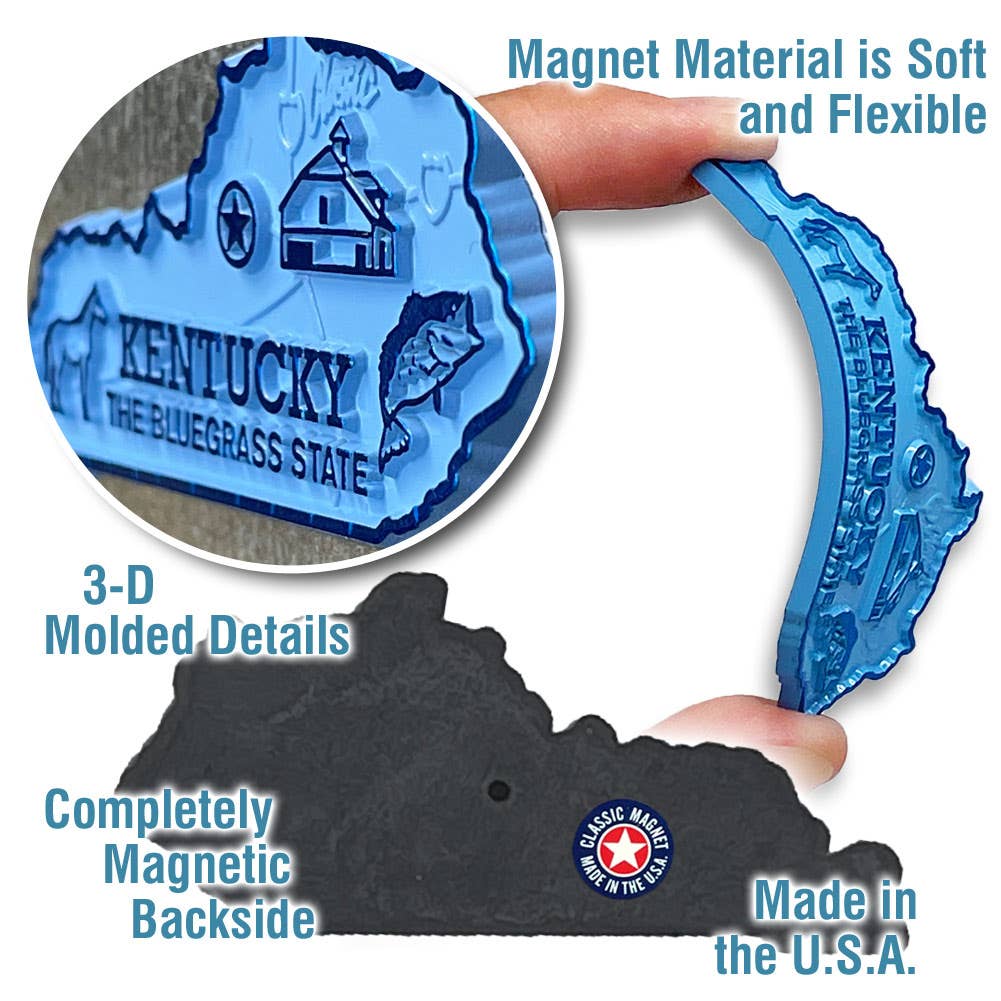 This Kentucky State Magnet measures approximately 2.5 square inches (roughly 1.5" x 1.75" - varies by shape) and has a thickness of 0.1". This magnet is perfect for any refrigerator or metal surface and makes a great gift or souvenir! Made of flexible molded rubber and is extremely durable. Plus, the magnets are 100% made in the USA.