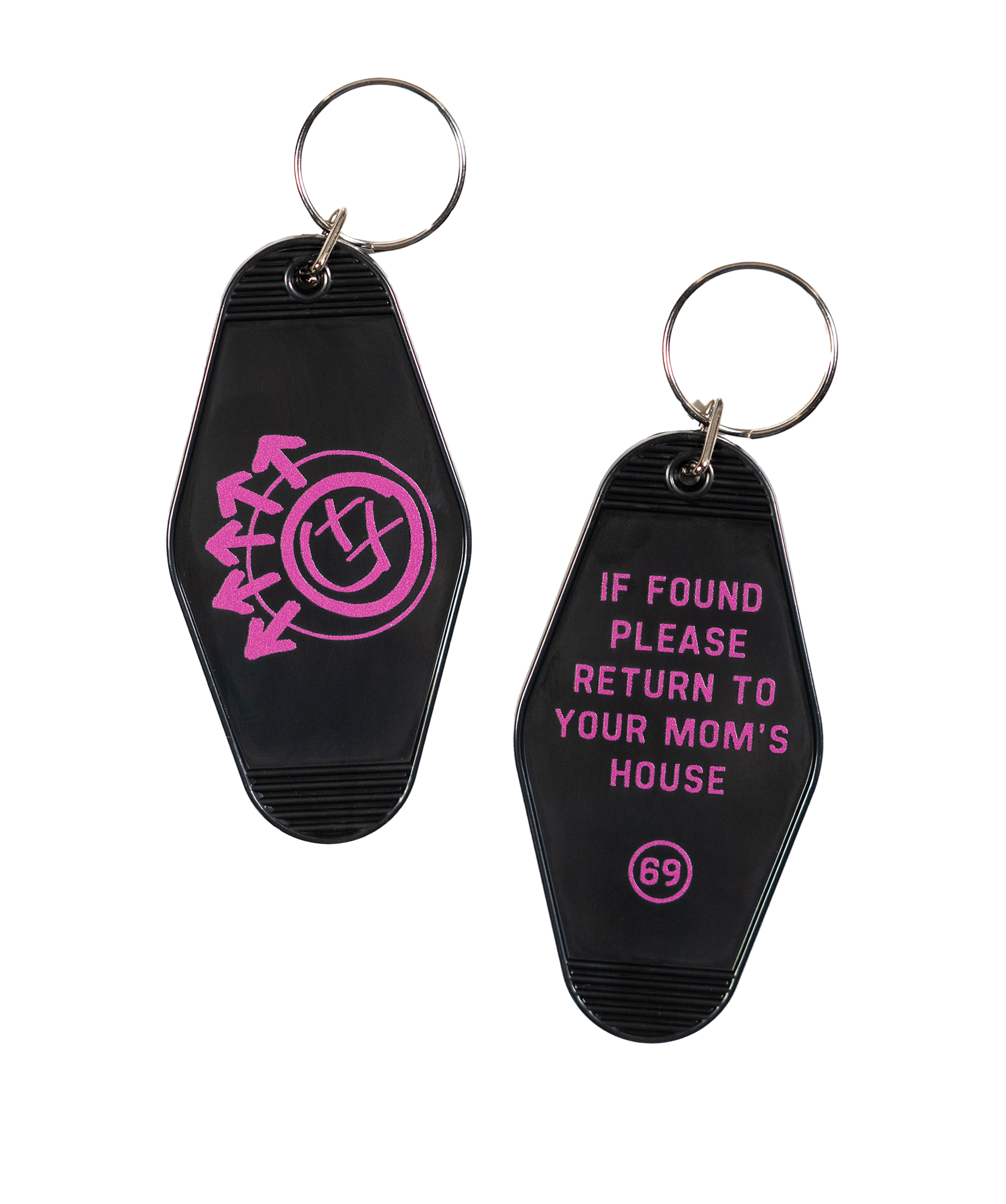 Classic motel vibes, juvenile energy. This double-sided key tag features blink-182’s smiley logo on one side and a polite request to return you to your mom’s house on the other. Room number? Obviously 69.
