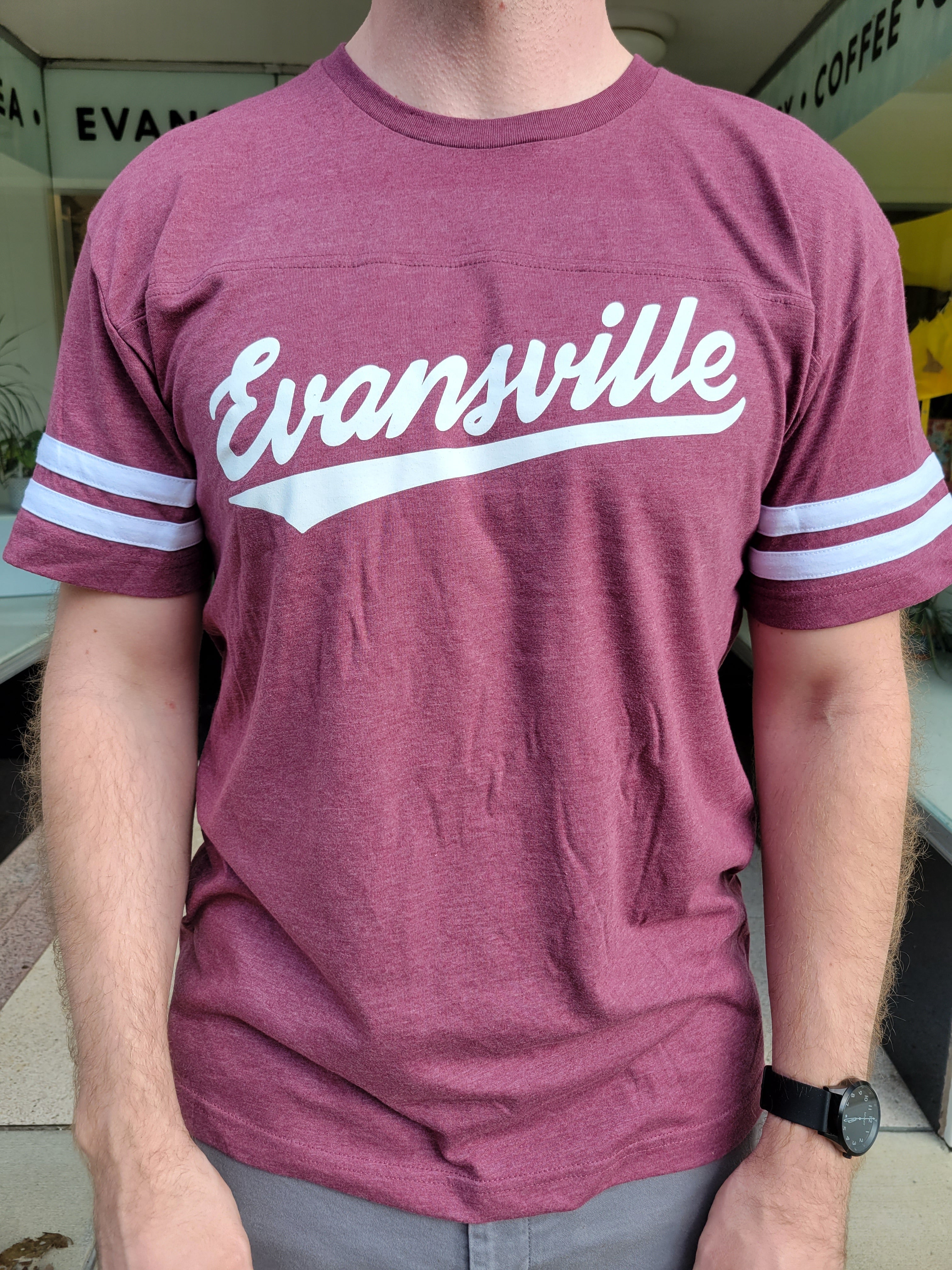 Burgundy Varsity Ringer Tee with the 'Evansville Script' design across the front.