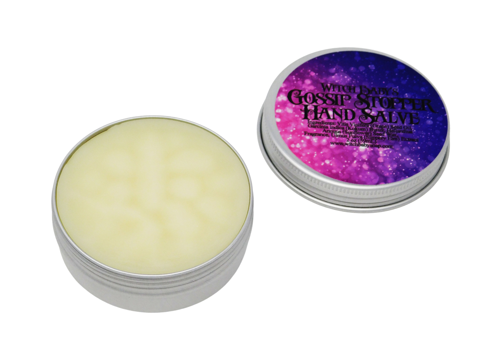 Detoxify the haters with the Gossip Stopper! Gossip Stopper Hand Salve is scented with Cinnamon, Clove, and Vanilla. It gets its gossip stopping properties from slippery elm bark. Slippery elm is used to stop gossip, slander, and libel. Kokum butter and grapeseed oil leave your hands feeling nourished and moisturized.