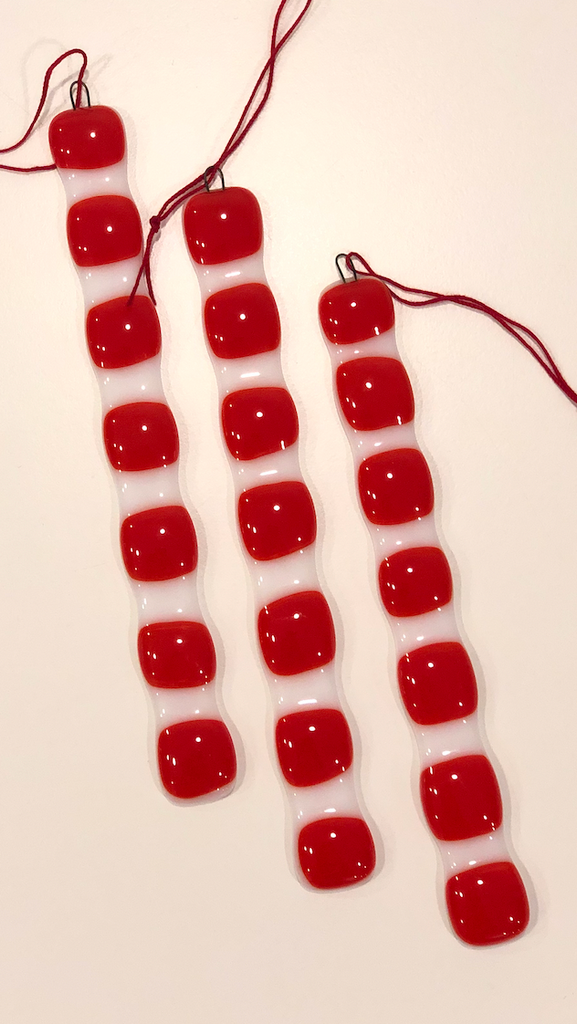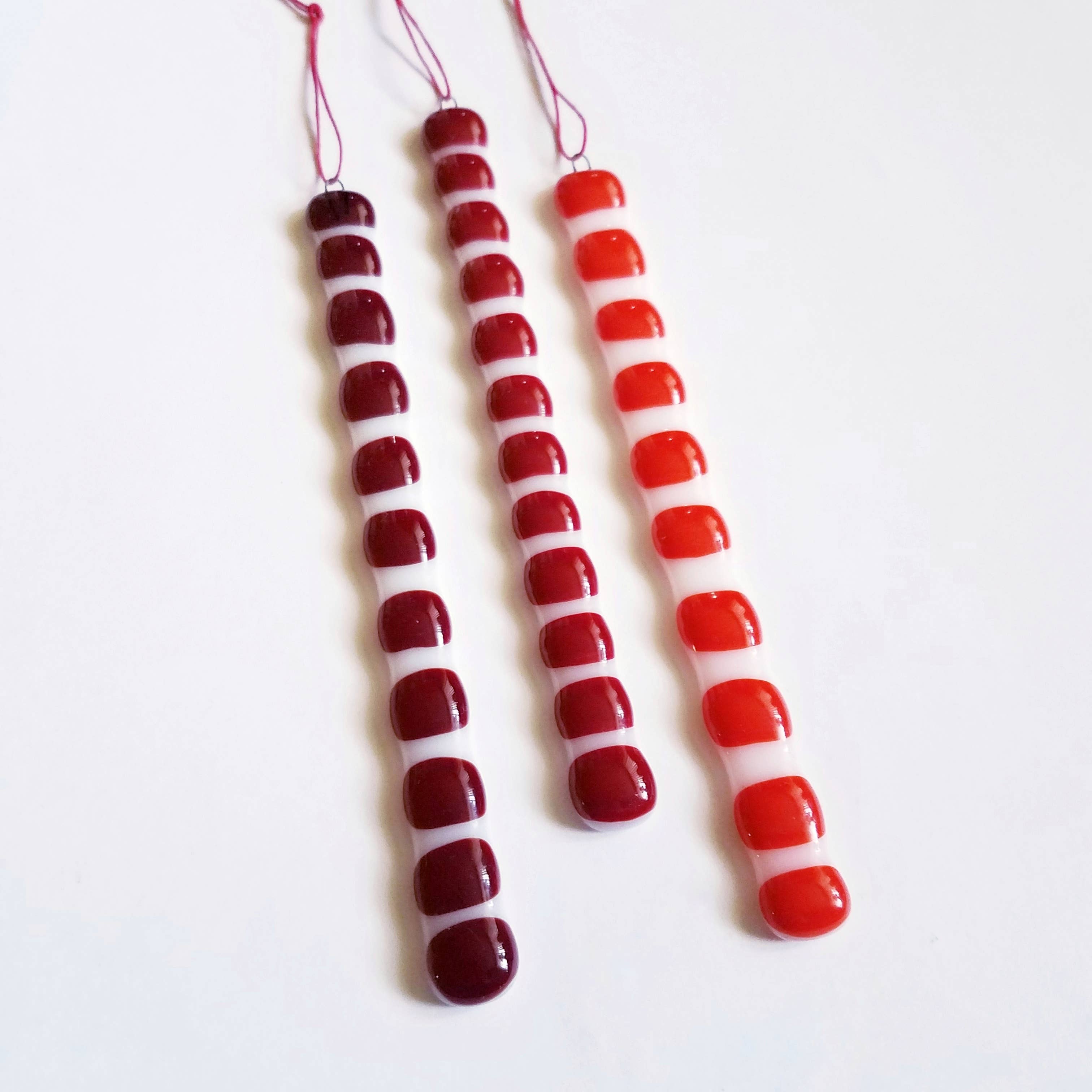 Our glass Peppermint Stick ornaments are simple yet playful, and measure 5 to 6 inches in length. Ornaments are made with a variety of reds and white. Add one-of-a-kind, handmade ornaments to your collection this year!