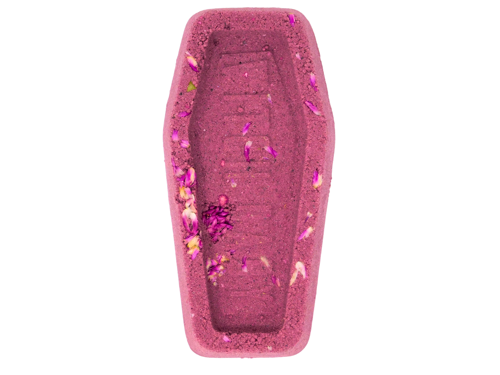 Step into Persephone’s garden with this intoxicating blend of poppy flowers, pomegranates and wet stone. This enthralling magenta coffin bath bomb is hand pressed with immortal amaranth blossoms.